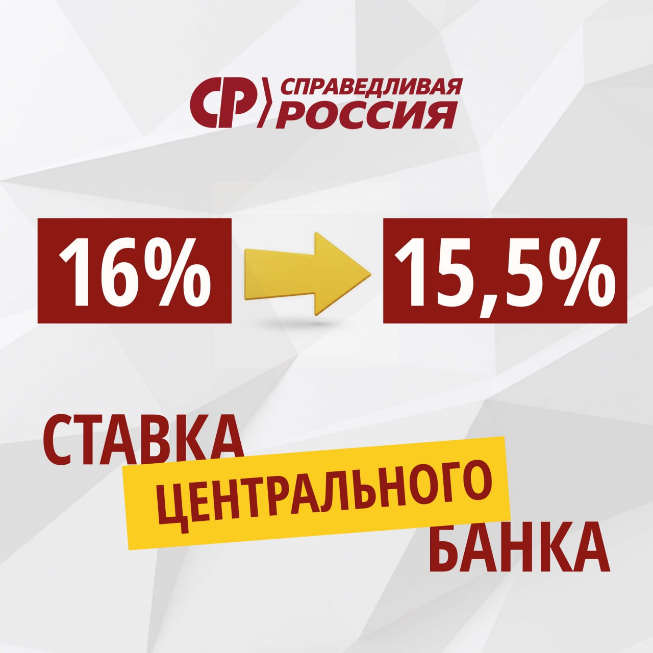 После всероссийской акции СПРАВЕДЛИВОЙ РОССИИ Центробанк снизил ключевую ставку с 16 до 15,5%!