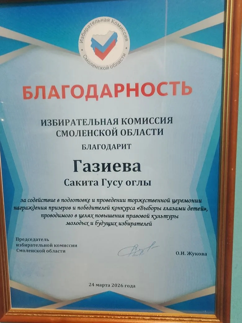В благодарственном письме отмечается участие депутата в подготовке и проведении торжественной церемонии награждения призёров и победителей конкурса "Выборы глазами детей", проводимой в целях повышения правовой культуры молодых и будущих избирателей.